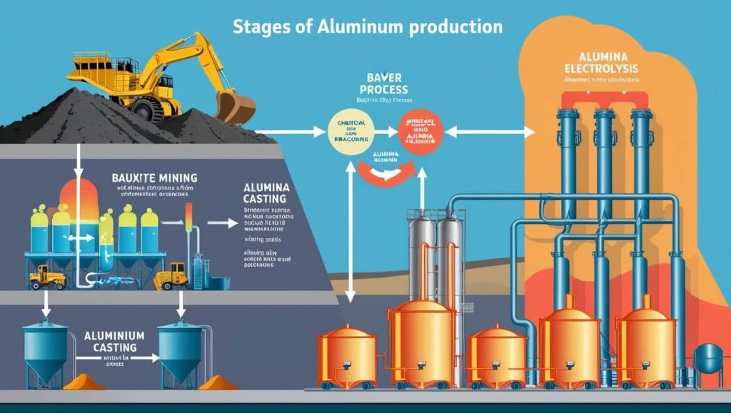 بوکسیت، منبع اصلی آلومینا، از هوازدگی سنگ‌های سیلیکاته مانند گرانیت و بازالت تشکیل می‌شود و حاوی ۳۰-۶۰% آلومینا است. استخراج آن شامل مراحل زیر است: